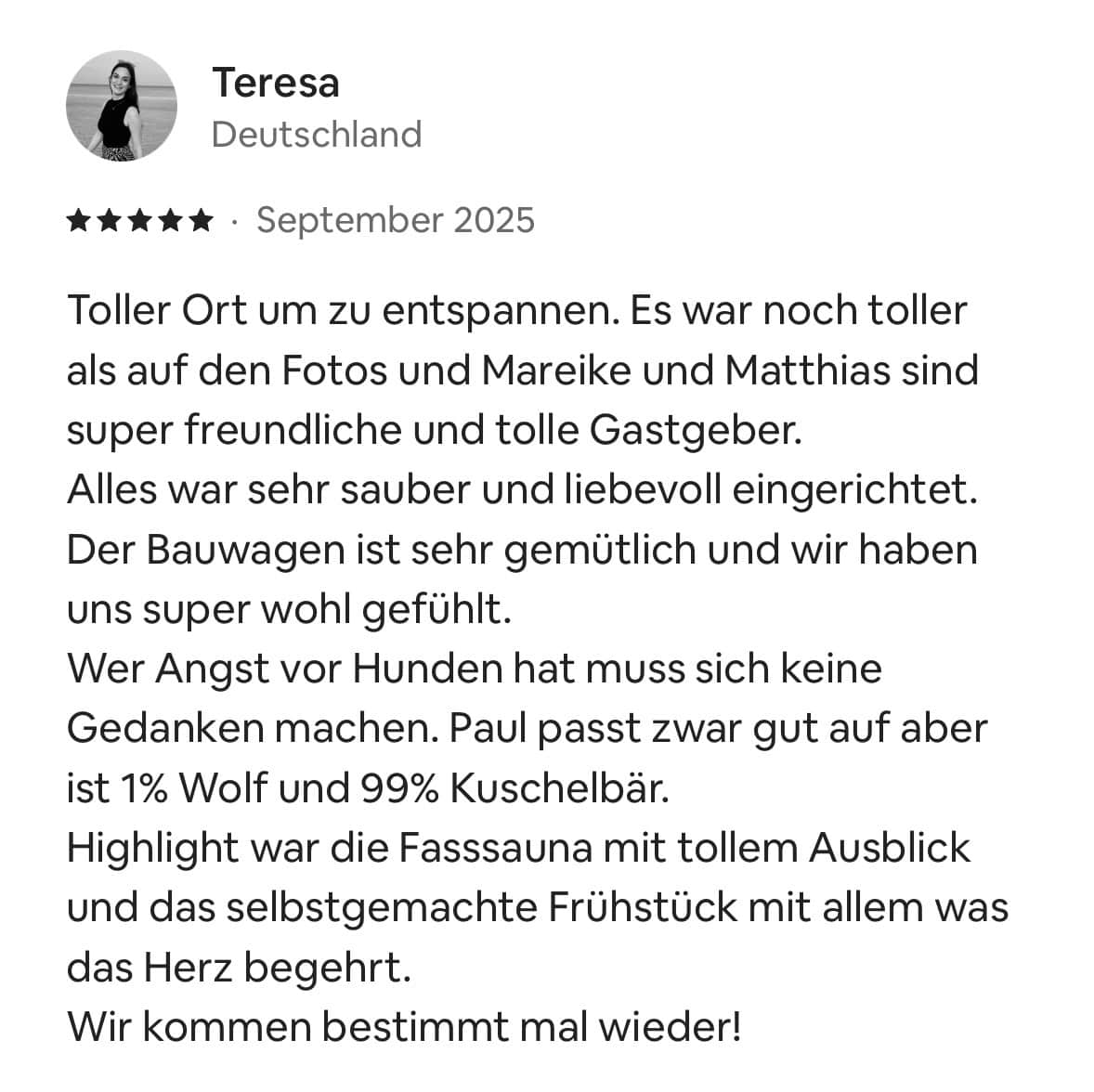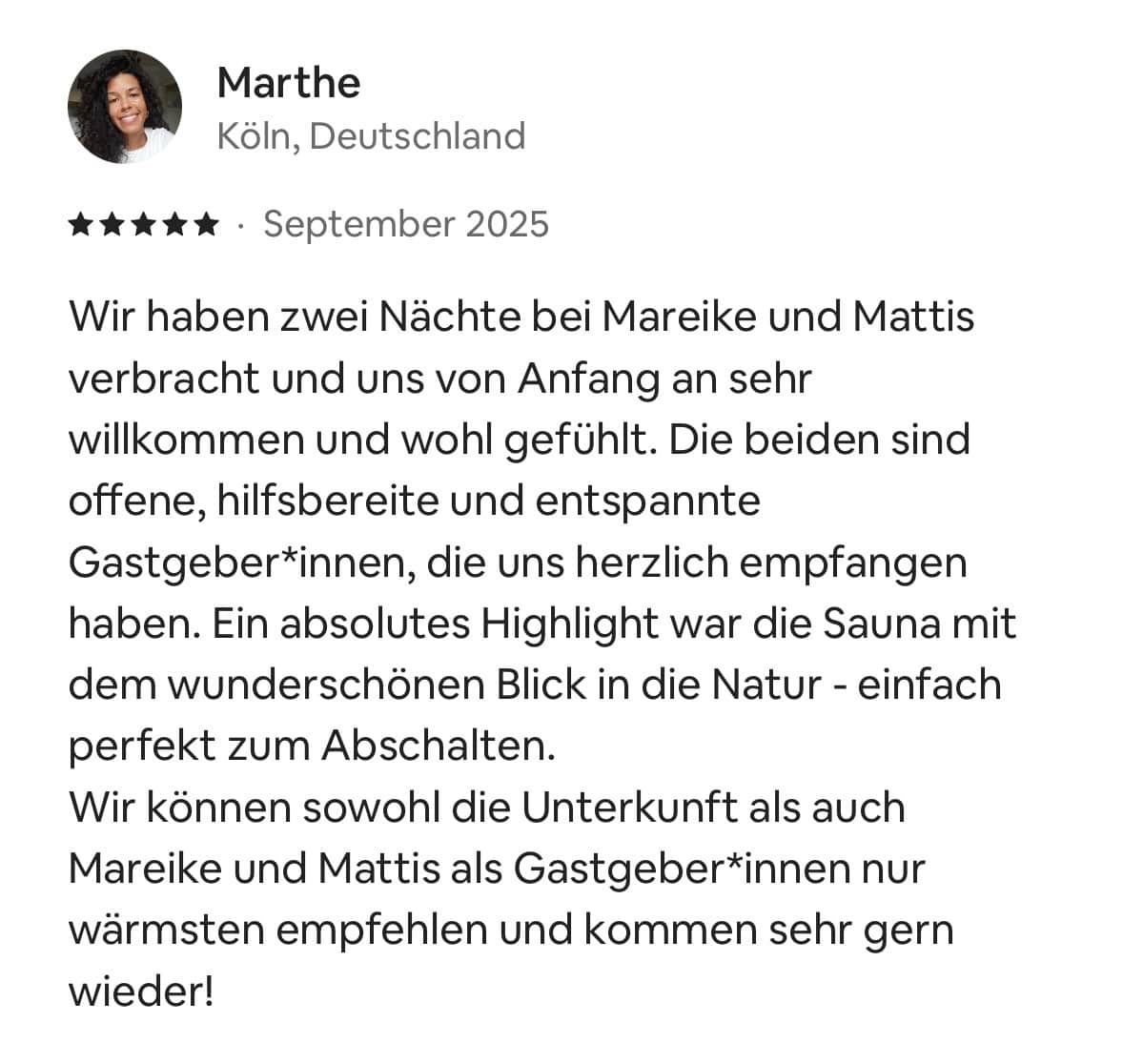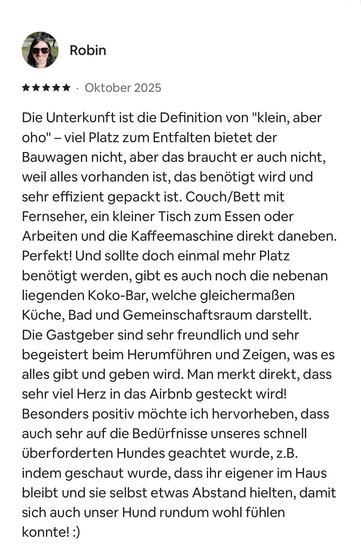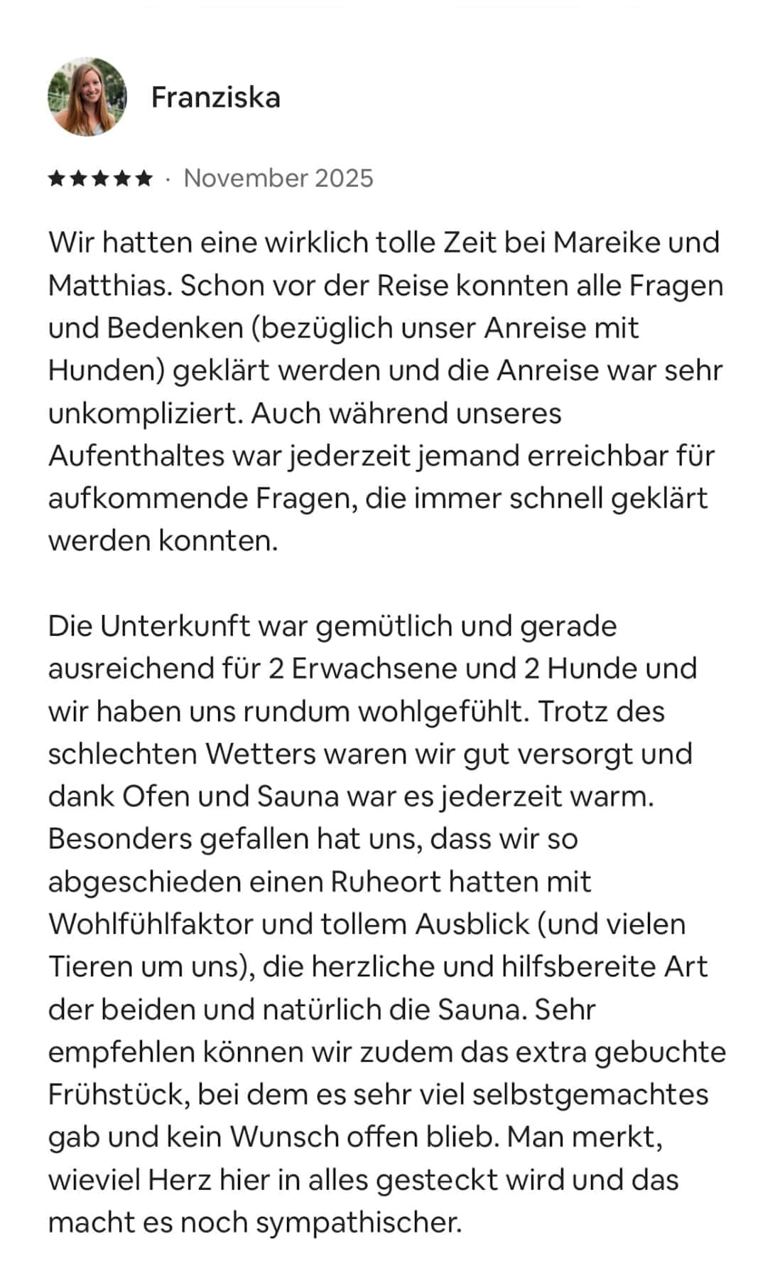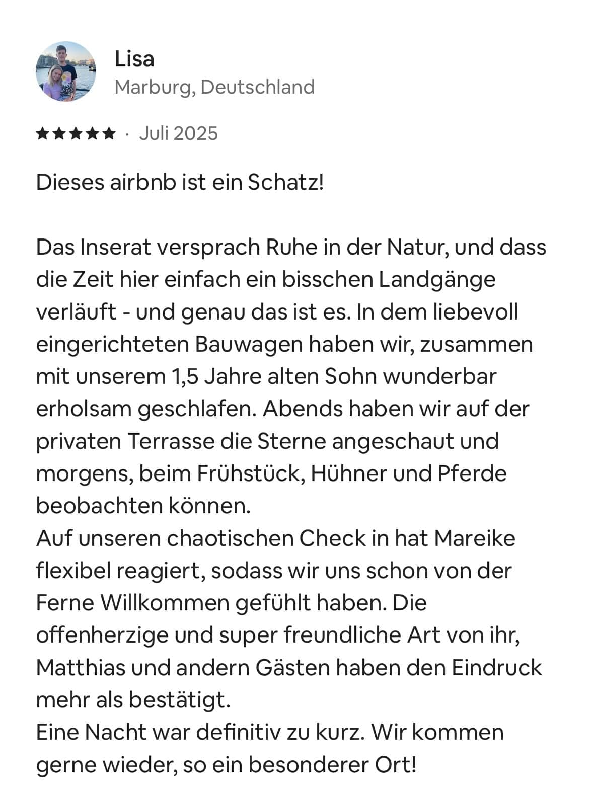 schön, dass du hier bist. Auf dieser Seite lassen wir unsere Gäste für uns sprechen – mit ihren eigenen Worten, Eindrücken und Lieblingsmomenten aus der Zeit bei uns. Jede einzelne Bewertung bedeutet uns unglaublich viel und wir sagen von Herzen Danke für all die lieben Worte und die tollen Sterne, die ihr uns geschenkt habt. Schau dich gern um, lass die Rückmeldungen auf dich wirken und bekomme ein Gefühl dafür, wie sich ein Aufenthalt bei uns anfühlt.